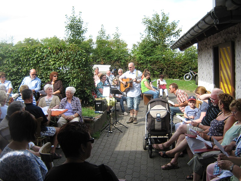 Zur feierlichen musikalischen Untermalung des Waldgottesdienstes trug diesmal Pfarrer Sorgatz selbst mit seiner Gitarre und Hartmut Sturm auf der Trompete bei. Wie in den Vorjahren sang der Gemischte Chor Daaden, auch in diesem Jahr wieder unter Leitung von Andrea Juhre, zwei schöne Lieder, die sich sehr gut in den feierlichen Gottesdienst einfügten. Verstärkt wurde der Chor durch Sängerinnen und Sänger aus Weitefeld.