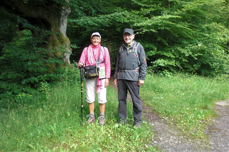 Der Weg führte die beiden nun sofort bergauf zur Hüllbuche (siehe Foto), weiter über die Hohe Ley bei Herdorf, den Druidenstein bis zum Ottoturm und zum nächsten Übernachtungsquartier in Kirchen. Es waren immerhin fast 20 anstrengende Kilometer zu bewältigen. Auf einer Teilstrecke begleitete sie auch der Vorsitzende des Daadener Wandervereins, Martin Schmidt.